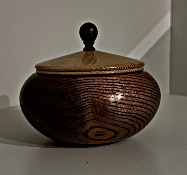Il corpo, colorato con alcol rosso e rifinito in nero per esaltare le venature, si contrappone armoniosamente al coperchio lasciato al naturale. Il pomello in rovere, ebanizzato con acetato di ferro, aggiunge un tocco di sofisticata profondità.